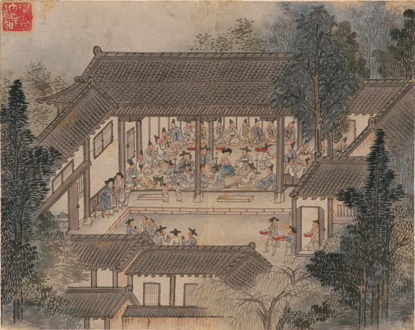 접시에는 진달래 꽃잎을 넣어 지진 화전과 탁주를 담은 술병이 올라 있었다. 술이 일순배 돌고 나자 분위기가 무척 좋아졌다. 이때 기생과 악공들이 올라왔다.