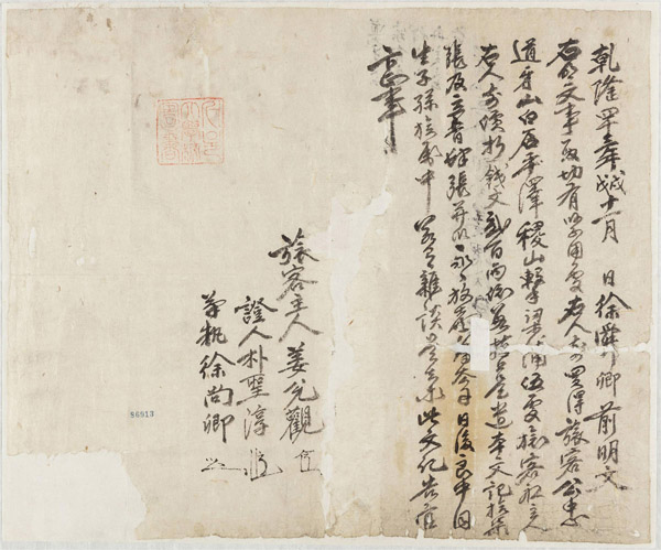 1778년 충남 아산 부근의 5개 여객주인권을 200냥에 매매하는 내용의 문기 (출처: 서울대 규장각한국학연구원)