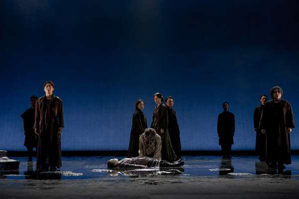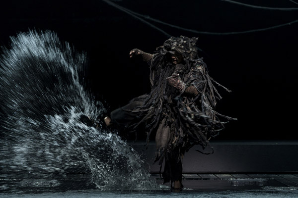 리어가 부르는 이 첫 소절은 이미 리어가 인생을 다 살았고 마치 인생에 무엇 하나 더 바라지 않는 신선같은 인물처럼 보이지만 실제 이렇게 한갓진 대사 뒤에 그에게 밀어닥치는 고난은 가히 천재지변급이다. 2021년 초연을 2024년에 재연을 올린 이 창극은 안무가인 정영두의 물 속에서의 안무가 돋보이며 창극이라기 보다는 창을 활용한 뮤지컬에 가깝다. 대사와 작창이 어디가 시작고 끝인지 눈치채지 못할 정도로 매끄럽게 이어졌던 전작 ‘트로이의 여인’들과 달리 ‘물:리어’에서는 대사는 대사고 노래는 노래다. 그리고 대부분의 노래는 철저하게 감상이며 드라마는 대사로 이어진다. 노래 자체로 아름다우나 노래가 시작되면 드라마가 멎고 노래를 감상하는 시간으로 들어가면서 극의 흐름이 느려지곤 한다. 그리고, 물이 있다. 마치 그리스 비극에서 흔히 그렇듯이 코러스들이 “물이여, 리어여”라고 외친다. 마치 물을 잊을까 걱정이라도 되는 듯…. 하지만 물은 무대 위에 계속 존재한다. 심지어 배우들이 물속에 들어가지 않아도 물은 때로는 배우보다 더 많은 시선을 앗아간다. “상선(上善)은 약수(若水)일러니 만물을 이로이 하되 다투지 아니하고 모두가 저어하는 낮은 데로 임하는” 첫 대목의 물 소개는 바로 이어지는 내용에 의해 갈기갈기 찢어진다. 리어의 딸들은 거칠게 물을 거스르며 물에 피를 섞는다. 하지만 물은 마를 수는 있어도 찢어질 수는 없는 물질이다. 리어의 비극에는 순환조차 없다. 누가 돌아올 것인가. 남는 것은 물에 휘감긴 오만 감정뿐이다. 하여 첫 대목은 그 나이를 먹고도 여전히 철이 들지 않은 리어의 한갓진 꿈인지, 그가 지향했던 이상향인지 알 수가 없다. 아쉬운 것은 역동적으로 드라마를 이끌어 가는 판소리가 이 안에서는 마치 싯구를 읊는 경기민요처럼 인물의 내면의 외침을 상징적으로 드러내는 용도로만 사용되었다는 점이다.