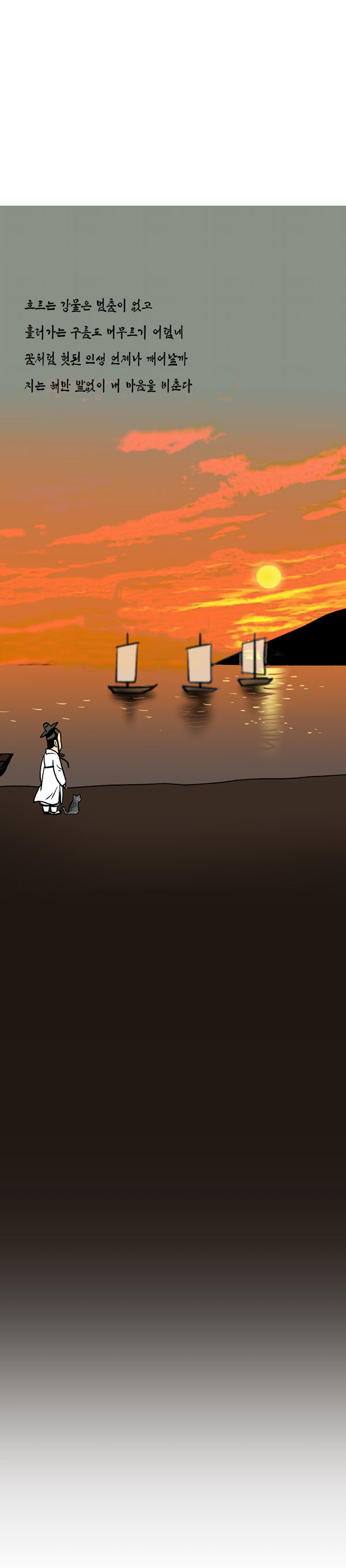 1715년 12월 6일. 오늘 엄경수는 서호로 행차에 나섰다. 날씨가 추워서 노량진에 얼음이 얼었고 양화진에는 떠도는 얼음덩이가 강을 덮고 있었다. 새로 언 얼음이 단단하지 않아서 밟고 건너기는 어려웠으며, 강을 떠도는 얼음덩이가 또한 배를 띄우기 어렵게 만들어서 원하는 데로 움직이기 힘들었다. 양화진 하류에 당도하니 작은 배가 왕래하고 있었는데, 배에는 대여섯 사람 탈 수 있고 말은 실을 수가 없었다. 그리하여 말을 강촌에 맡겨두고 엄경수만 배에 올랐다.