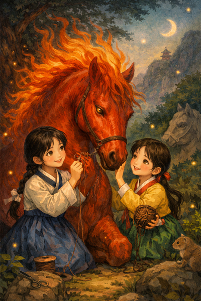 두 소녀는 손을 붙잡고 기뻐했다. 나무꾼 아저씨의 넋 나간 얼굴이 너무 불쌍했던 탓이다. 어머니가 준 팥죽 때문에 말에서 떨어졌는데 이 말이 놀라서 하늘로 날아가다가 그만 목이 툭 떨어지면서 망허산 어디쯤 떨어진 것 같으니 찾아달라는 부탁을 받고 왔으니, 임무 완수였다.